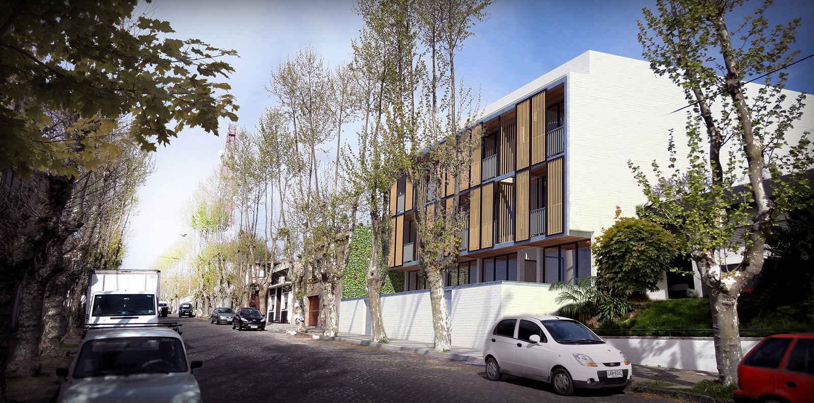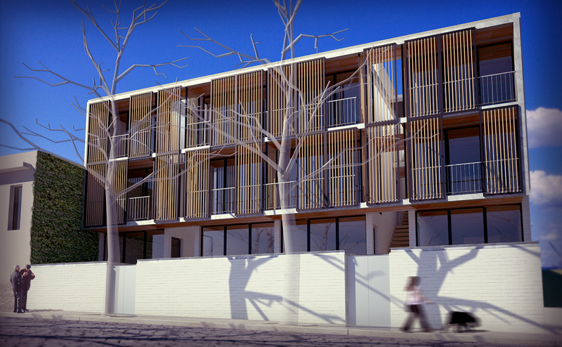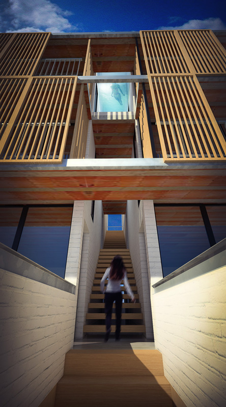 In the front you can see the development of a reclaimed wood blinds which assist managing solar supply. The project also includes the development of organic gardens on the terrace, the recovery of rainwater and service bicycles to travel around this beautiful city on the Uruguayan coast.