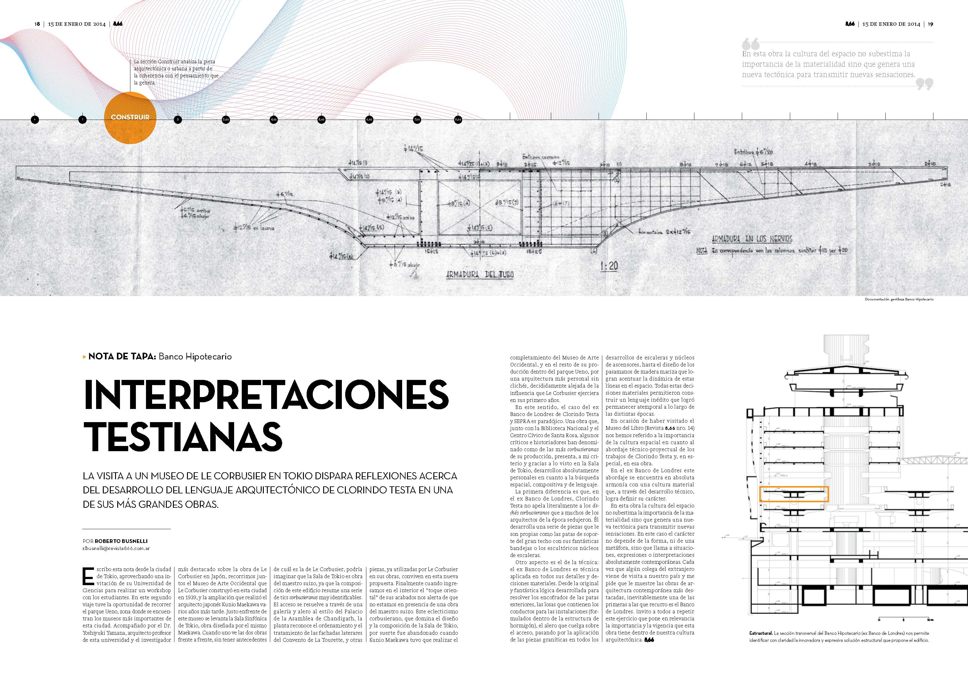 Escribo esta nota desde la ciudad de Tokio, aprovechando una invitación de la Universidad de Ciencias de esta ciudad para realizar un workshop con sus estudiantes. En este segundo viaje tuve la oportunidad de recorre el parque Ueno, zona donde se encuentran los museos más importantes de esta ciudad. Acompañado por el Dr. Yoshiyuki Yamana (1), arquitecto profesor de esta universidad y el investigador más destacado sobre la obra de Le Corbusier en Japón, recorrimos juntos el Museo de Arte Occidental que LC construyera en esta ciudad en el año 1939 y la ampliación que realizara el arquitecto japonés Kunio Maekawa varios años mas tarde. Justo enfrente de este museo se levanta la Sala Sinfónica de Tokio, obra diseñada por el mismo KM. La primera sensación cuando uno ve las dos obras frente a frente, y sin tener antecedentes de cuál es la obra de LC, uno podría imaginar que la Sala de Tokio podría ser su obra ya que la composición de este edificio resume una serie de tics corbusieranos muy identificables. El acceso se resuelve a través de una galería y alero de acceso al estilo del Palacio de la Asamblea de Chandigarh, la planta reconoce el ordenamiento y el tratamiento de las fachadas laterares del Convento de La Tourette y asi sucesivamente podríamos ir identificando distintos “piezas” utilizadas por LC en sus edificios todas conviviendo en esta nueva propuesta. Finalmente cuando ingresamos en el interior el “toque oriental”, de sus acabados, nos alerta de que no estamos en presencia de una obra del maestro francés. Este eclecticismo corbusierano que domina el diseño y la composición de la Sala de Tokio, por suerte, fue abandonado cuando Kunio Maekawa tuvo que realizar el completamiento del Museo de Arte Occidental, y en el resto de su producción dentro del parque Ueno, por una arquitectura más personal sin “cliches”, decididamente alejada de la influencia que LC ejerciera en sus primero años. En este sentido el caso del Banco de Londres de Clorindo Testa es paradójico. Una obra que, junto con la Biblioteca Nacional y el Centro Cívico de Santa Rosa, algunos críticos e historiadores han denominado como de las más corbusieranas de su producción, presenta, a mi criterio y gracias a lo visto en la Sala de Tokyo, desarrollos absolutamente personales en cuanto a la búsqueda espacial, compositiva y de lenguaje.