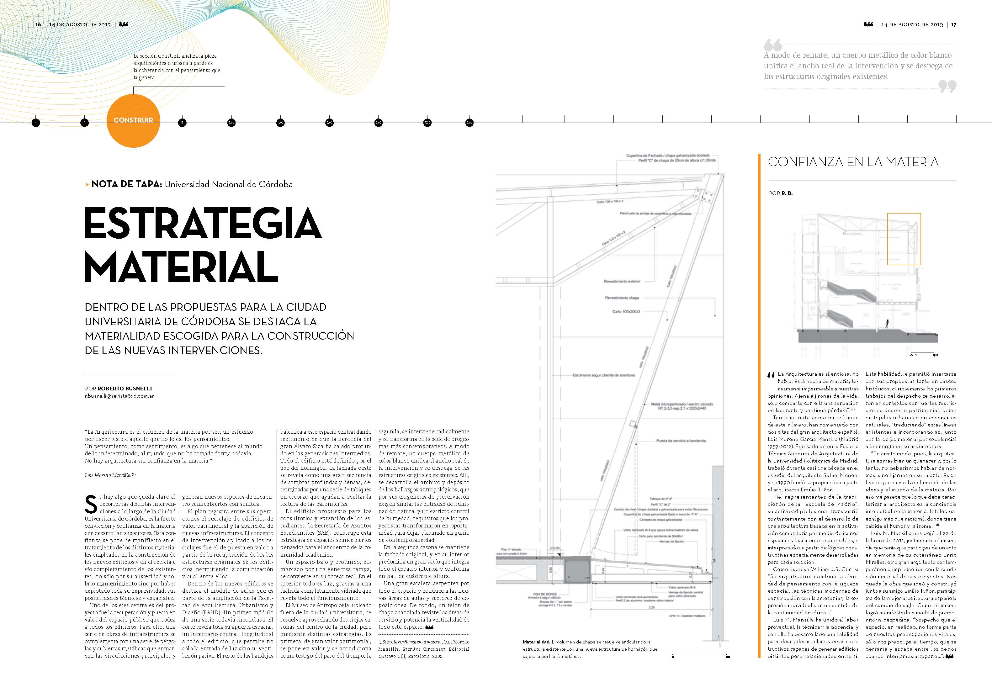 Si hay algo que queda claro al recorrer las distintas intervenciones a lo largo del campus de la Universidad de Córdoba es la fuerte convicción y confianza en la materia desarrolladas por el equipo liderado por los arquitectos Cristian Nanzer, Alejandro Cohen Arazi, Alberto Baulina, Gaspar Jarris e Inés Saal. Esta confianza se pone de manifiesto en el tratamiento de los distintos materiales, empleados en la construcción de los nuevos edificios y en el reciclaje y/o completamiento de edificios existentes, no solo por su austeridad y sobrio mantenimiento sino por haber explotado toda su expresividad, sus posibilidades técnicas y espaciales.